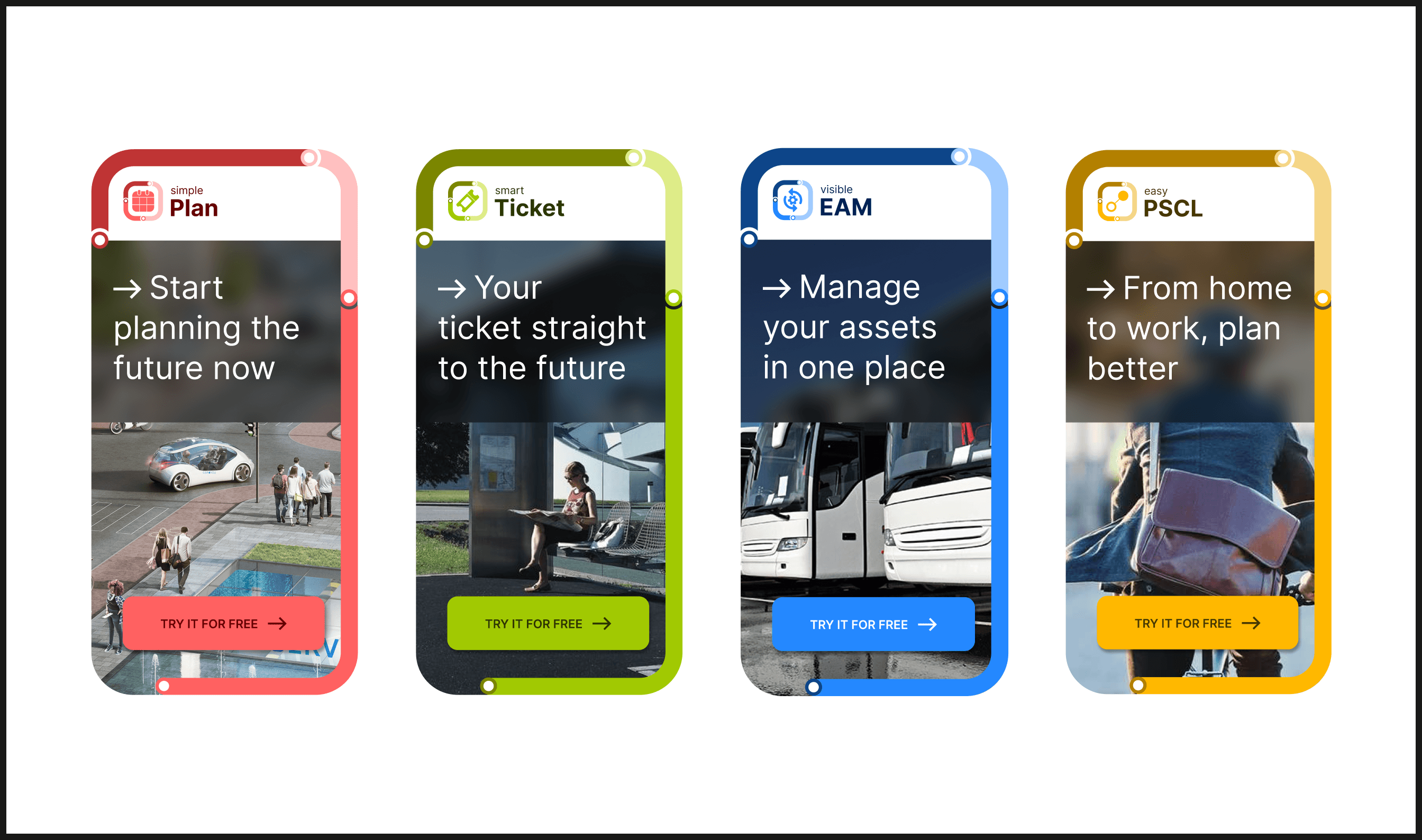 Next Suite - A brand new visual identity for a package of software solutions. The suite consists of four individual products, all of which contribute to efficient and environmentally friendly mobility in urban areas.